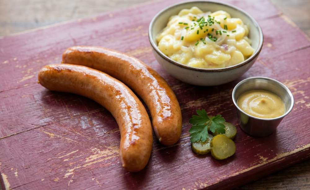 Bockwurst the classic way: warm sausage, mild mustard, pickles and Southern German potato salad.